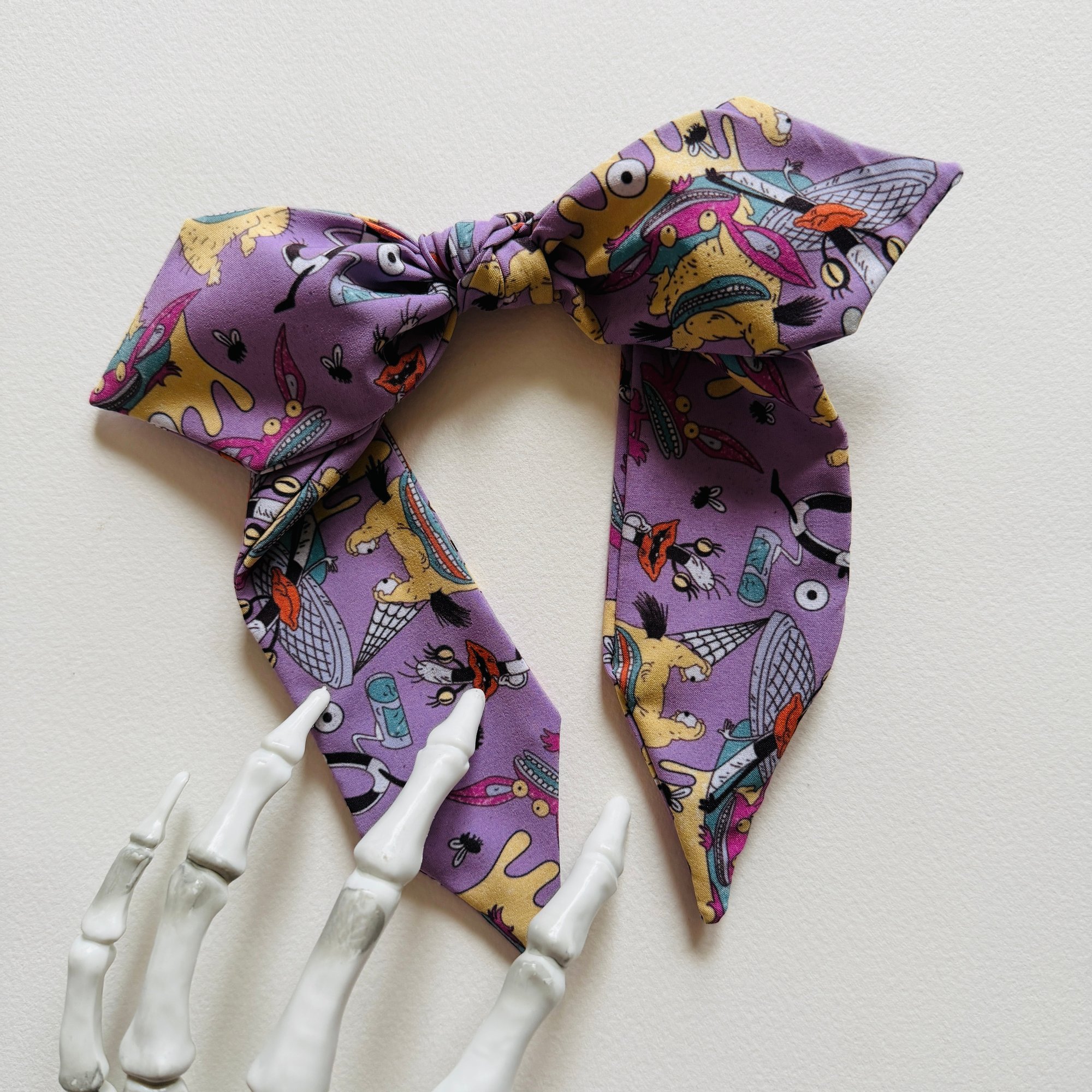 Cotton fabric. Bow on top can slide to either side. One size fits most (adults & children)