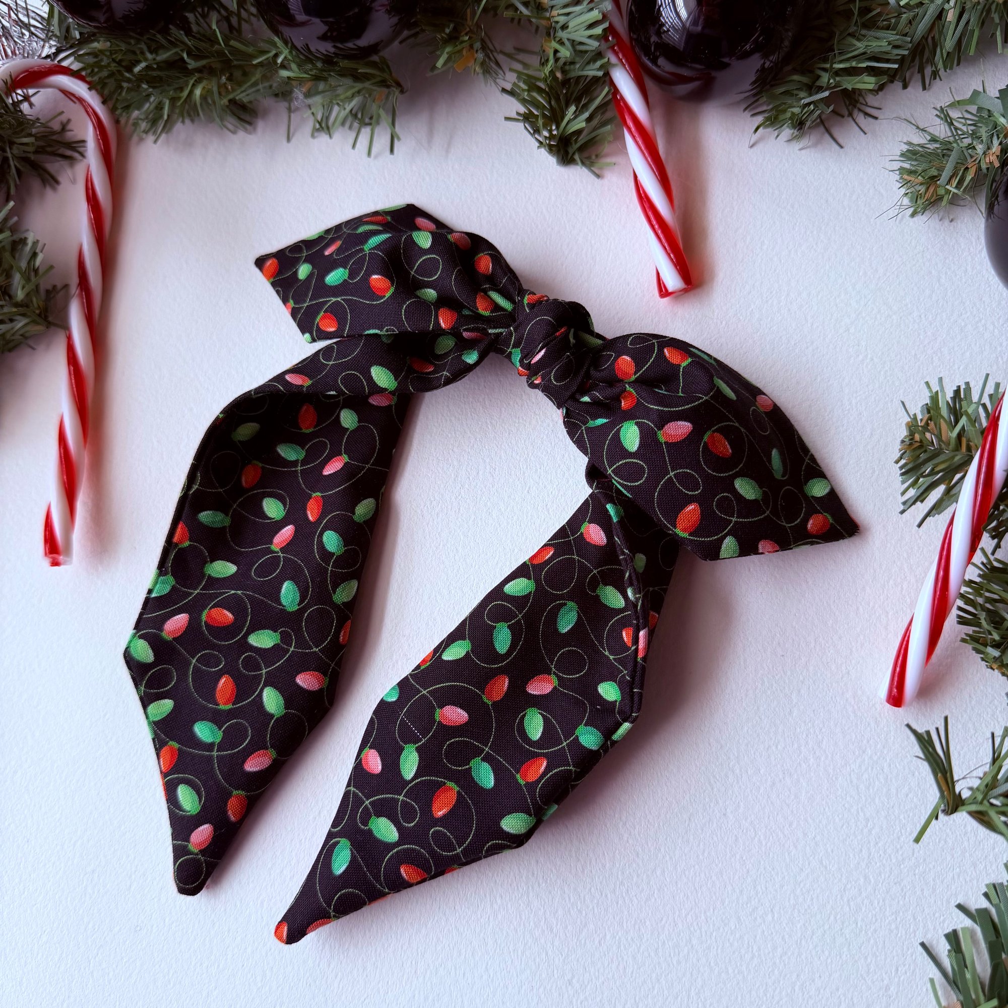 Cotton fabric. Bow on top can slide to either side. One size fits most (adults & children)