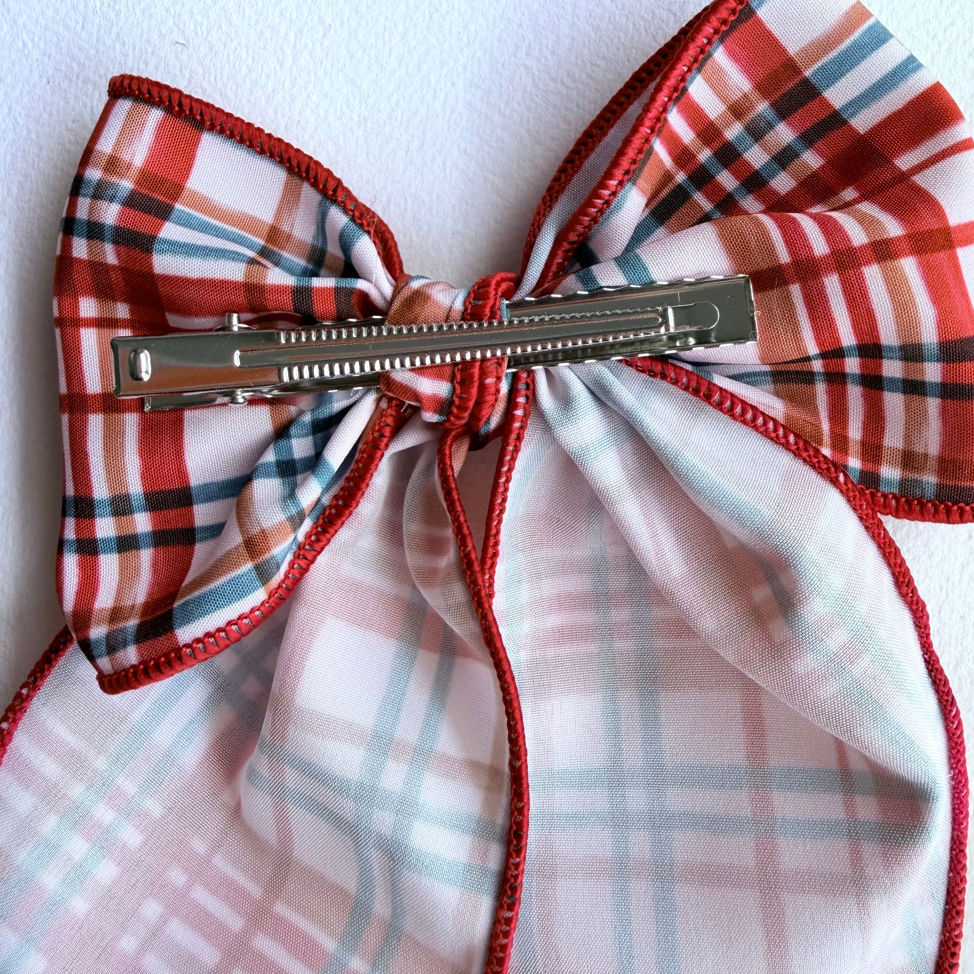 Hand tied bow on metal alligator clip. Approx. 5.5" wide. Listing is for 1 bow.