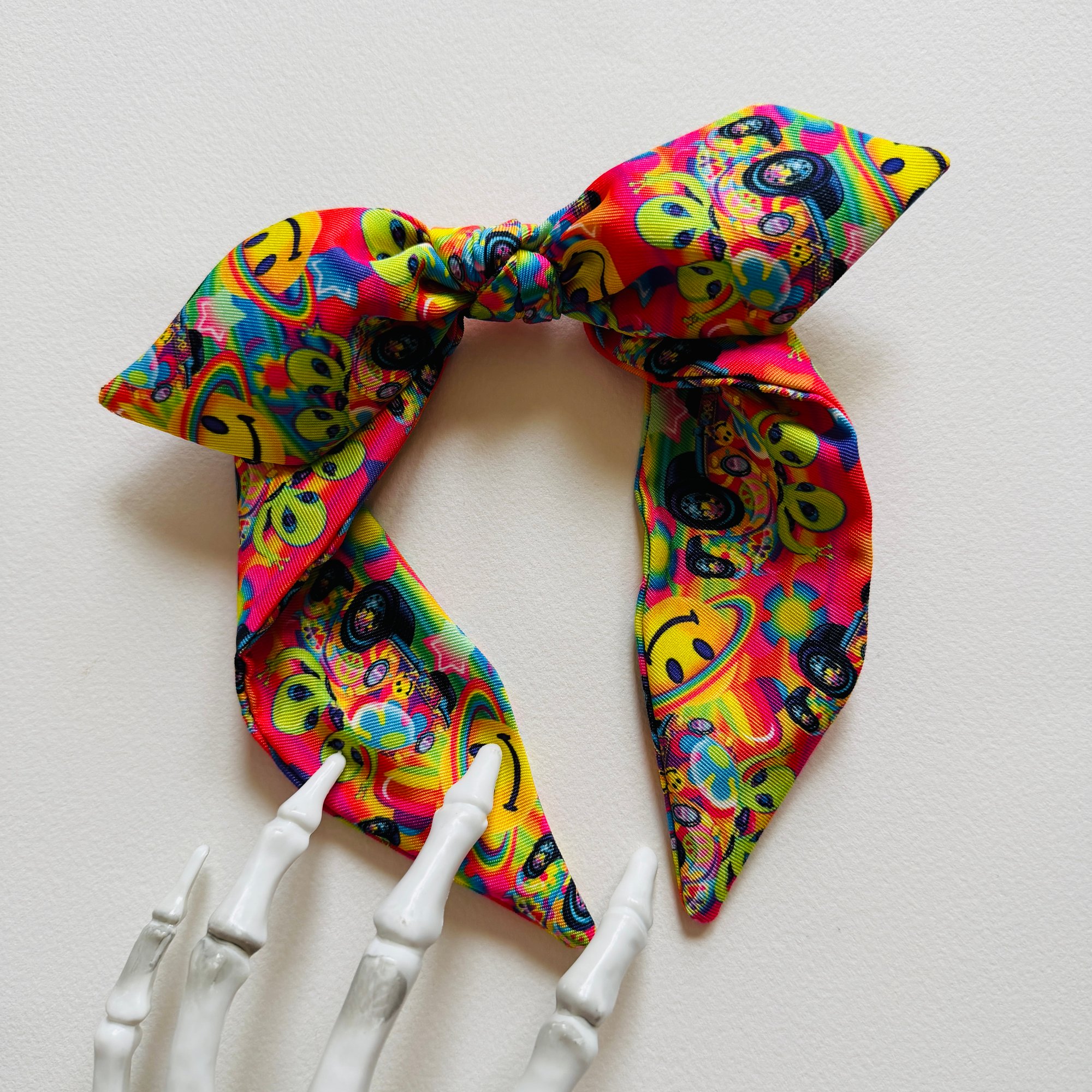 Cotton fabric. Bow on top can slide to either side. One size fits most (adults & children)