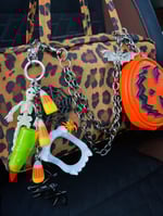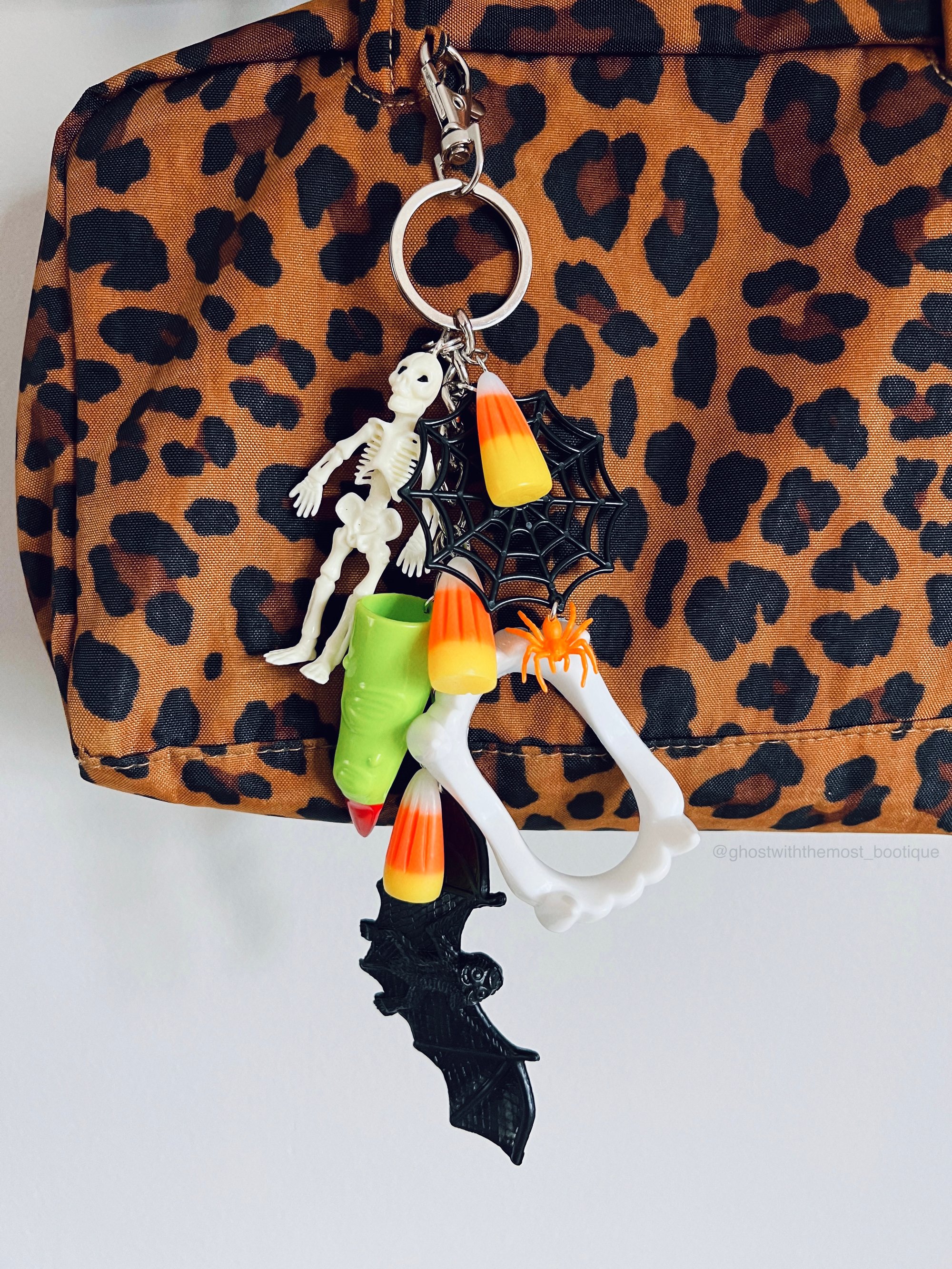 All the goody bag classics from the 90's in one bag charm! Plastic vampire teeth, rubber witch finger, web with spider, bendy skeleton, rubber bat, & candy corn! Metal clip keychain. About 10" long. Can be clipped to your bag, keys, or anywhere that needs a little touch of spooky nostalgia!