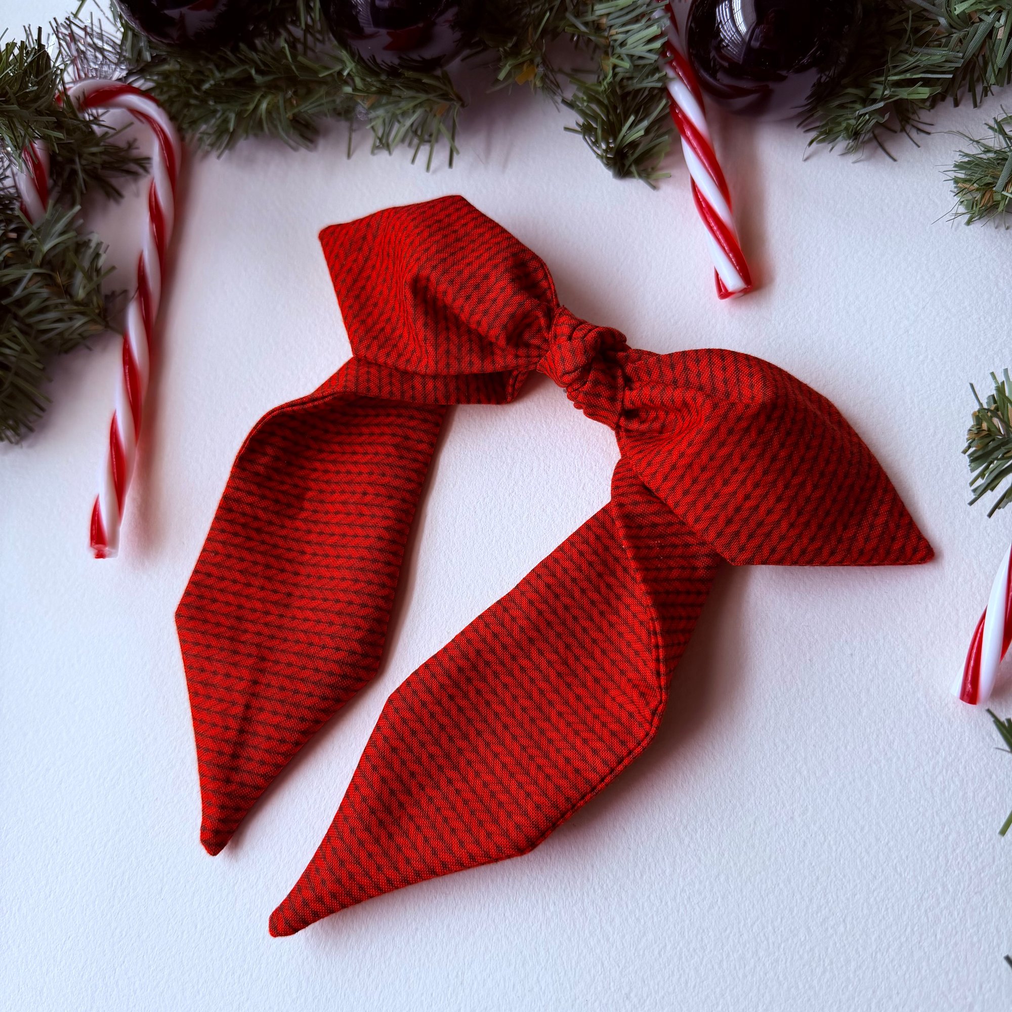 Cotton fabric. Bow on top can slide to either side. One size fits most (adults & children)
